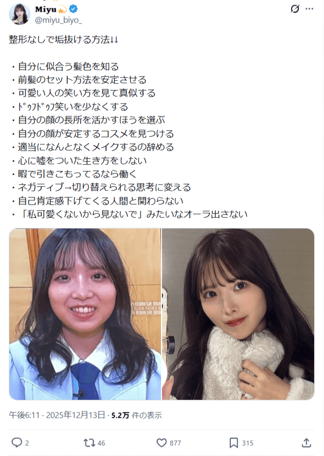 そして、こうした火種があるからこそ、 本人が「整形しなくても垢抜けられます」と添えた意図も見えてくる。 強い主張で殴るのではなく、受け手の立場が違うことを前提に、逃げ道を残す言い方。 それでも賛否は起きるが、少なくとも“煽って伸ばす”タイプの投稿とは違う印象だ。